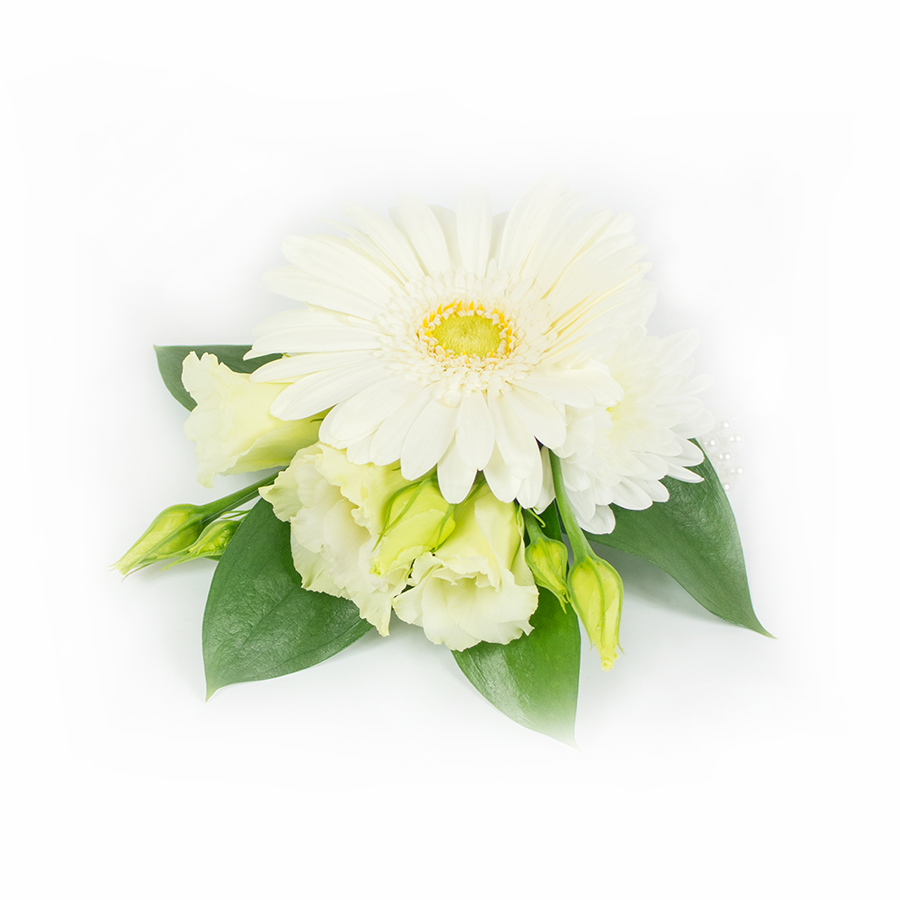 Embrace elegance with our luxurious white floral corsage, artfully arranged with a blend of gerbera, alstroemeria, and chrysanthemums. This refined bouquet, with its subtle pearly white palette, sets a graceful tone for any special event, from proms to bridal celebrations. Each bloom is hand-selected to ensure the highest quality and unmatched freshness.