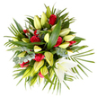 Discover the elegance of our hand-tied bouquet, featuring white Oriental lilies and velvety red roses. Accented with salal and palm leaves, this arrangement offers a unique and sophisticated presentation.