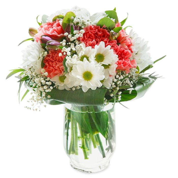 Immerse yourself in the beauty of our handcrafted bouquet, featuring a stunning combination of snow-white chrysanthemums, delicate gypsophila, and soft light pink carnations, all elegantly wrapped in lush aspidistra leaves. This unique arrangement is designed to bring a touch of sophistication and charm to any setting.
